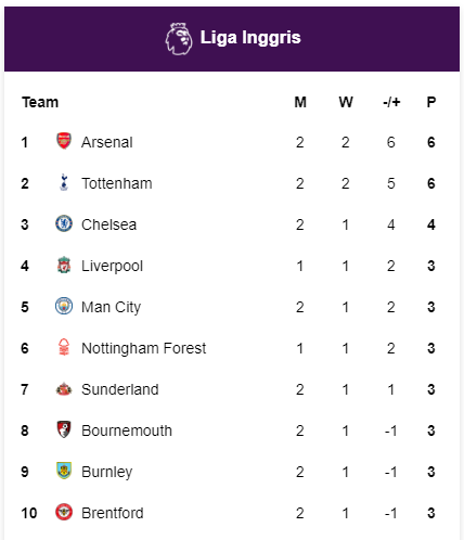 Arsenal kini memimpin klasemen sementara Premier League dengan koleksi enam poin. The Gunners tampil konsisten dalam dua laga awal musim ini.