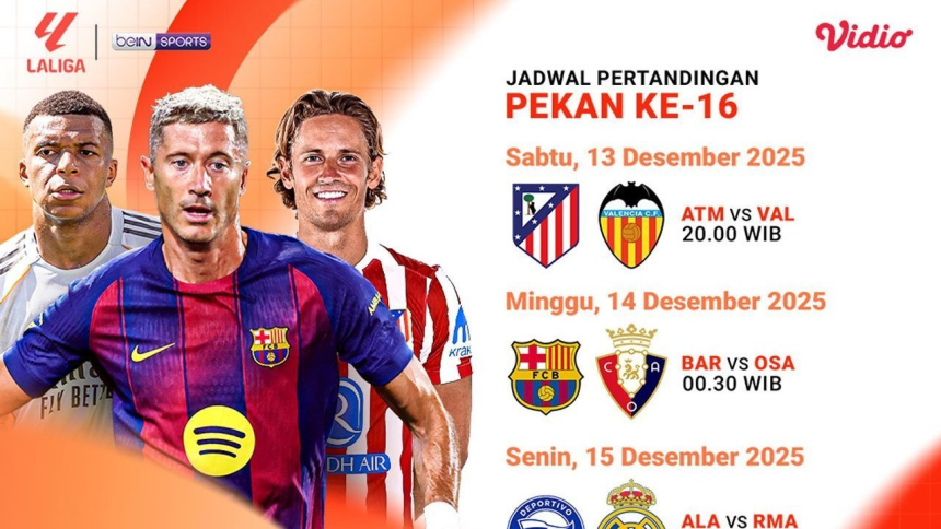 BOLA CAMAR – Jadwal pertandingan Liga Spanyol 2025/26 kini memasuki jornada ke-16 atau matchday 16 yang bakal berlangsung pekan ini, 13 hingga 16 Desember 2025 mendatang. Seluruh laganya bakal disiarkan langsung eksklusif melalui layanan OTT Vidio.